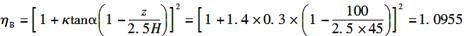 根据《建筑结构荷载规范》(GB 50009—2012)第8.2.1条表8.2.1可知,100m处,B类,风压高度变化系数μz=2.00,tanα=45/100=0.45>0.3,取tanα=0.3;根据第8.2.2条式(8.2.2)计算,顶部的修正系数为:则建筑屋面D处的风压高度变化系数为:ηBμz=1.0955×2.00=2.191。由此可知,B项数值最为接近。