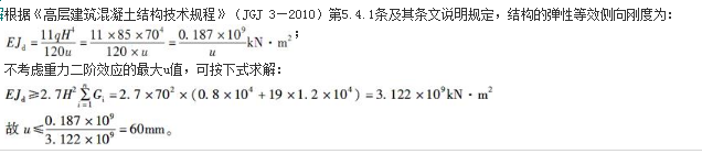 在水平力作用下,计算该高层建筑结构内力、位移时,若不考虑重力二阶效应的不利影响,则其顶点质心的弹性水平位移u的最大值应为( )mm。