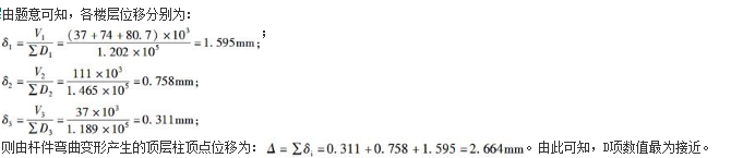 已知各楼层的抗侧刚度D值的总和分别为∑D3=1.189×105N/mm,∑D2=1.465×10^5N/mm,∑D1=1.202×10^5N/mm,由杆件弯曲变形产生的顶层柱顶点位移Δ最接近于( )mm。
