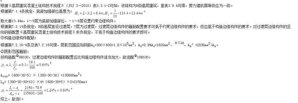 7层某剪力墙(非短肢墙)边缘构件如图6-13所示,阴影部分为纵向钢筋配筋范围,墙肢轴压比μN=0.4,纵筋混凝土保护层厚度为30mm。试问,该边缘构件阴影部分的纵筋及箍筋选用下列何项,能满足规范、规程的最低抗震构造要求?( )