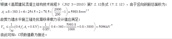 假定,核心筒剪力墙Q2第30层墙体及两侧边缘构件配筋如图6-6所示,剪力墙考虑地震作用组合的轴压力设计值N为3800kN。试问,剪力墙水平施工缝处抗滑移承载力设计值V(kN),与下列何项数值最为接近?( )