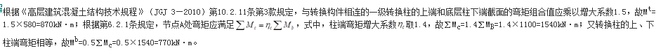 地上第2层某转换柱KZZ,如图23(z)所示,假定该柱的抗震等级为一级,柱上端和下端考虑地震作用组合的弯矩组合值分别为580kN·m、450kN·m,柱下端节点A左右梁端相应的同向组合弯矩设计值之和∑MB=1100kN·m。假设,转换柱KZZ在节点A处按弹性分析的上、下柱端弯矩相等。试问,在进行柱截面设计时,该柱上端和下端考虑地震作用组合的弯矩设计值Mt、Mb(kN·m)与下列何项数值最为接近?( )A870