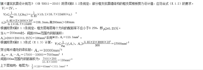 在第③轴底层落地剪力墙处,由不落地剪力墙传来按刚性楼板计算的框支层楼板组合的剪力设计值为3000kN(未经调整)。②~⑦轴处楼板无洞口,宽度15400mm。假定剪力沿③轴墙均布,穿过③轴墙的梁纵筋面积As1=10000mm2,穿墙楼板配筋宽度10800mm(不包括梁宽)。试问,③轴右侧楼板的最小厚度tf(mm)及穿过墙的楼板双层配筋中每层配筋的最小值为下列何项时,才能满足规范、规程的最低抗震要求?( )