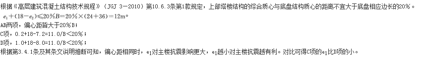 假定,该建筑物塔楼质心偏心距为e1,大底盘质心偏心距为e2,见图24。如果仅从抗震概念设计方面考虑,试问,偏心距(e1,e2;单位:m)选用下列哪一组数值时结构不规则程度相对最小?( )A0.0;0.0