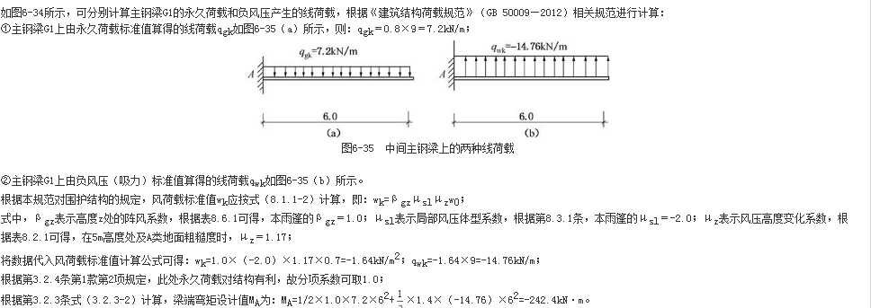 计算一大雨篷中间主钢梁的梁端弯矩设计值,如图6-34所示。该雨篷的主钢梁G1与型钢混凝土框架柱相连,柱距为9m,主钢梁悬挑长度为6m。主钢梁上铺设带金属边框构件的采光玻璃,其重量包括主钢梁在内为0.80kN/m2。钢梁面标高为5.0m。该建筑在10m高度处的基本风压w0=0.70kN/m2,地面粗糙度为A类。现需计算在雨篷结构永久荷载和风的负风压(吸力)作用下主钢梁G1的梁端弯矩设计值MA=( )kN·m。