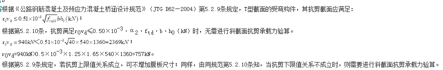 上述桥梁的中间T型梁的抗剪验算截面取距支点h/2(900mm)处,且已知该截面的最大剪力r0v0为940kN,腹板宽度540mm,梁的有效高度为1360mm,混凝土强度等级C40的抗拉强度设计值ftd为1.65MPa。试问,该截面需要进行下列何项工作?( )