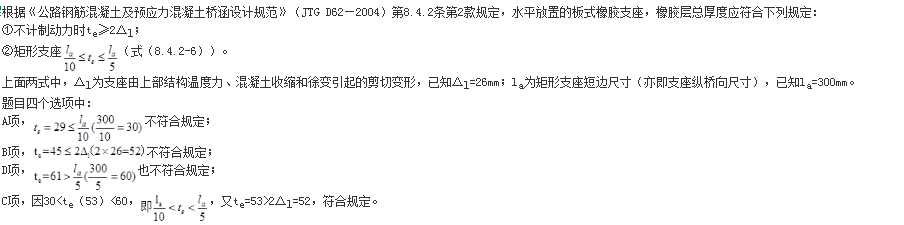 某高速公路上的一座高架桥,为三孔各30m的预应力混凝土简支T形梁桥,全长90m,中墩处设连续桥面,支承采用水平放置的普通板式橡胶支座,支座平面尺寸(长×宽)为350mm×300mm。假定,在桥台处由温度下降、混凝土收缩和徐变引起的梁长缩短量△l=26mm。试问,当不计制动力时,该处普通板式橡胶支座的橡胶层总厚度te(mm)不能小于下列何项数值?( )