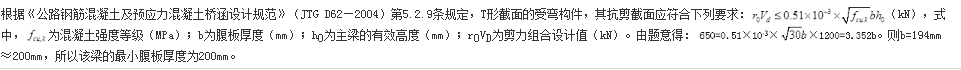 某公路桥在二级公路上,重车较多,该桥上部结构为装配式钢筋混凝土T形梁,标准跨径20m,计算跨径为19.50m,主梁高度1.25m,主梁距1.8m。设计荷载为公路-I级。结构安全等级为一级。梁体混凝土强度等级为C30。按持久状况计算时某内主梁支点截面剪力组合设计值650kN(已计入结构重要性系数)。试问,该梁最小腹板厚度(mm)与下列何项数值最为接近?( )