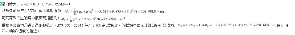 某混凝土简支梁桥,计算跨径L=7.5m,梁截面尺寸为;b=300mm、h=750mm。该桥承受永久荷载(不包括梁自重)g=9.875kN/m,均布可变荷载(汽车)q=7.5kN/m。(混凝土容重γ=25kN/m3)。则该桥跨中截面计算弯矩最接近于( )kN·m。