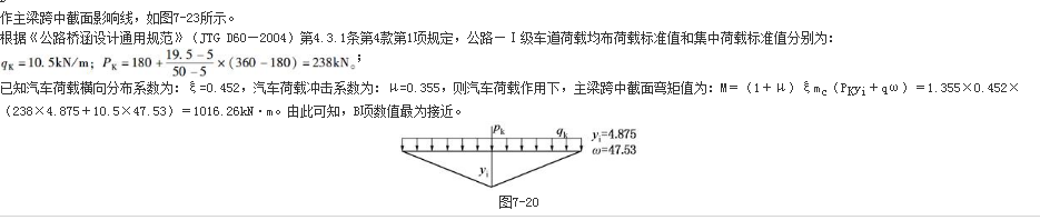某混凝土简支梁桥由多片T型梁,其计算跨径L=19.5m,设计荷载为公路—Ⅰ级。其单片主梁断面尺寸如图7-22所示,采用C30混凝土,fcd=13.8M图7-22Pa,ftd=1.39MPa,主筋为HRB400钢筋,fsd=330MPa。结构重要性系数γ0=1,试根据《公路桥涵设计通用规范》(JTG D60—2004)及《公路钢筋混凝土及预应力混凝土桥涵设计规范》(JTG D62—2004)进行设计计算。假设T型主梁Ic=0.2m4,跨中处每延米重度G=10kN/m。
