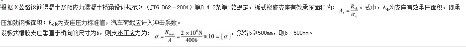假定上述桥梁每个支座在恒载和活载作用下,最大垂直反力为2000kN。拟选用板式橡胶支座的板厚为42mm、顺桥向的尺寸为400mm,则所需板式橡胶支座的平面尺寸最接近于( )。