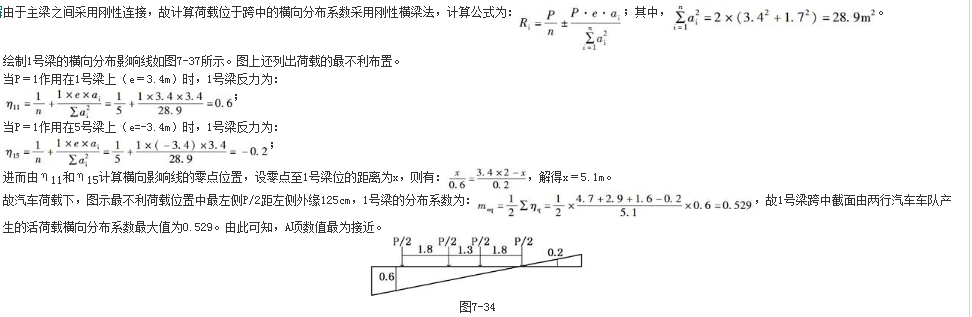 图7-33所示混凝土T形梁桥,其计算跨径为19.50m,全长19.96m,横截面布置如图所示。该主梁之间采用刚性连接,由5片主梁构成,跨中及支点设置横隔梁。主粱间距1.7m,边梁外悬臂长度为0.85m。桥梁设计荷载为公路—Ⅰ级。