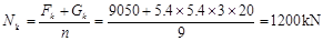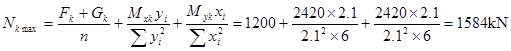 根据《建筑桩基技术规范》(JGJ 94—2008)第5.2.1条第1款规定,桩基竖向承载力计算应符合下列要求:荷载效应标准组合,轴心竖向力作用下;偏心竖向力作用下除满足上式外,尚应满足下式的要求,。 ①计算Nkmax: 根据第5.1.1条第1款式(5.1.1-1)计算,轴心竖向力作用下基桩的平均竖向力为:偏心竖向力作用下基桩的竖向力为: