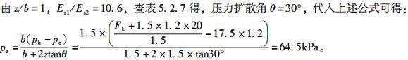 式中,b为矩形基础或条形基础底面的宽度(m);pk为相应于荷载效应标准组合时,基础底面处的平均压力值(kPa);pc为基础底面处土的自重压力值(kPa);z为基础底面下垫层的厚度(m);θ为垫层的压力扩散角,宜通过试验确定,当无试验资料时,可按表5.2.7采用。