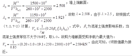 根据《高层建筑混凝土结构技术规程》(JGJ 3—2010)第7.2.7条式(7.2.7-4)计算,剪力墙剪跨比可按下式计算,墙下端截面: