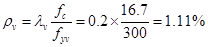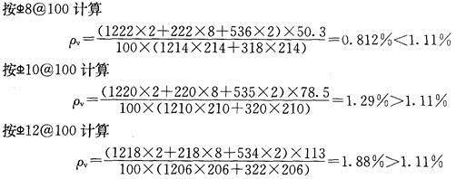 根据《建筑抗震设计规范》(GB 50011—2010)第6.4.5条表6.4.5-2可知,箍筋最小直径为8mm,最大间距为l00mm;根据表6.4.5-3可得,λv=0.2,则根据式(6.3.9)计算,其相应体积配箍率的最低要求为:满足最小箍筋构造要求。 根据《混凝土结构设计规范》(GB 50010—2010)第6.6.3条规定,体积配箍率即指核心面积范围内单位混凝土体积所含间接钢筋的体积,根据式(6.6.3-2)计算,可求出剪力墙边缘构件的体积配箍率。