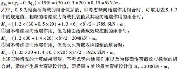 根据《建筑抗震设计规范》(GB 50011—2010)相关规范进行计算: ①当考虑竖向地震作用效应组合时(γG=1.2,γEv=1.3): 根据第5.3.3条规定,竖向地震作用标准值的线荷载gEk值取用构件上重力荷载代表值的15%进行计算,即: