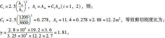 某高层建筑有抗震设防的底层大空间剪力墙结构,转换层以上楼层层高2.7m,横向剪力墙有效截面面积Aw2=19.2m2;框支层层高3.6m,横向落地剪力墙有效截面面积Aw1=11.4m2,框支层全部柱总截面面积Ac=2.88m2,柱截面均为1200mm×1200mm,混凝土强度等级框支层为C40,上层C25。下列各项中上下层刚度比正确的是( )。