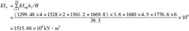 ⑥结构顶点假想位移 把各楼层重力荷载折算成连续均布荷载,有:q=∑Gi/H=89500/39.3=2277.35kN/m; 当λ=1.20时,位移系数ψu=8.07,结构顶点假想位移为:μT=ψuqH4/100EIw=8.07×2277.35×39.34/100×1515.69×106=0.289m; ⑦结构基本自振周期 根据《高层建筑混凝土结构技术规范》(JGJ 3—2010)第4.3.17条及附录C式(C.0.2)计算,取自振周期折减系数为:ψT=1.0,故结构基本自振周期为: