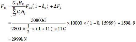 根据《高层民用建筑钢结构技术规程》(JGJ 99—98)第4.3.4条式(4.3.4-4)计算,顶部附加地震作用系数为:根据第4.3.4条式(4.3.4-3)计算,顶部附加地震作用为:ΔFn=δnFEk=0.15989×10000=1598.9kN;则顶层总水平地震作用标准值为: