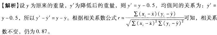 某种零件的长度与重量的相关系数为0.87。如果每个零件的重量降低0.5克,那么调整后零件的长度与重量的相关系数是( )。