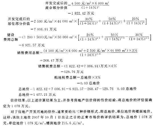 对于房地产开发用地的估价,通常要给出三种价格形式,即总地价、单位地价和楼面地价。这样,该块土地在2007年10月1日出让之日的正常市场价格评估结果为:总地价4940万元,单位地价4940元/m2,楼面地价988元/m2。
