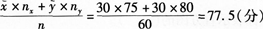 设男生成绩为x,女生成绩为y,男女各30人,故全班的平均考试成绩为: