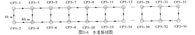1.根据《客运专线无砟轨道铁路工程测量暂行规定》第4章相关规定:①CPⅢ控制网建网测量标志主要包括预埋件、棱镜杆、高程杆和棱镜。②CPⅢ控制点的埋设:CPⅢ控制点应沿线路布置在路基两侧的接触网杆或基础、桥梁防撞墙、隧道侧壁上,当CPⅢ控制点布置在桥梁防撞墙上时,点位应设置在桥墩固定支座端上方的防撞墙上。CPⅢ控制点沿线路布置时,纵向间距宜为60m左右,且不应大于70m,横向间距不超过结构宽度。各CPⅢ点应大致等高,其高度应在设计轨道顶面以上30cm的地方。③CPⅢ控制点编号:CPⅢ控制点编号的标注应全线统一采用大小为4cm的正楷字体刻绘,并用白色油漆抹底,绿色油漆填写编号字体。CPⅢ的点号由七位数组成,从左到右前四位数表示CPⅢ点所在里程的整千米数,第五位是“3”表示是CPⅢ网点,后两位数字表示点的顺序号,点的顺序号为单数表示该点在里程增加方向的左侧,点的顺序号为双数表示该点在里程增加方向的右侧,当里程不足千、百、十千米时,加“0”填充,以保证CPⅢ的点号都是七位数。CPⅢ网测量的自由设站点号也由七位数组成,从左到右第一位为大写英文字母“Z”,表示测站,第二、三、四、五位数为CPⅢ点所在里程的整千米数,第六、七位数字表示测站的序号,当里程不足千、百、十千米时,加“0”填充,以保证CPⅢ的自由设站号都是七位数。 2. 测量方法一:往测时以轨道一侧的CPⅢ水准点为主线贯通水准测量,另一侧的CPⅢ水准点在进行贯通水准测量摆站时就近观测;返测时以另一侧的CPⅢ水准点为主线贯通水准测量,对侧的水准点在摆站时就近联测。 测量方法二:CPⅢ点与CPⅢ点之间的水准路线,采用如图3-4所示的水准路线形式进行。3. CPⅢ控制网测量完成后需提交的成果包括:平面观测、高程观测网图,平面观测、高程观测原始观测数据,平面观测、高程观测手簿,CPⅢ控制点、高等级水准点检核数据,平面计算(边长、角度)表,平面坐标平差表、各项精度统计表,高差计算表(含尺长改正),高程平差表、各项精度统计表,CPⅢ点平面和高程成果表,技术设计书,技术总结报告。