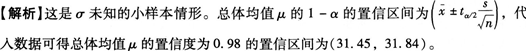 =31.645,样本方差s2=0.O9,则总体均值μ的置信度为0.98的置信区间为( )。