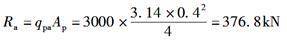 嵌入完整硬岩直径为400mm的钢筋混凝土预制桩,桩端阻力特征值qpa=3000kPa,初步设计时,单桩竖向承载力特征值Ra为( )kN。