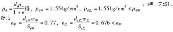 塑性指数Ip甲=wL甲-wp甲=17.5,Ip乙=wL乙-wp乙=7.7<Ip甲,塑性指数越大,相对黏粒含量越多;B项,天然密度ρ=ρd(1+w),故ρ甲=1.989g/cm3,ρ乙=1.954g/cm3<ρ甲;C项,由干密度