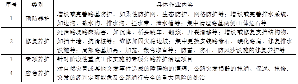 根据《公路养护工程管理办法》规定,路基的养护工程作业内容如表1-6-1所示。从表中可知,增设或完善排水系统属于预防养护。 表1-6-1 路基养护工程作业内容