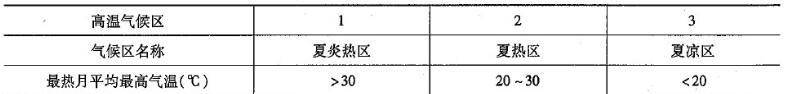 气候分区的高温指标:采用最近30年内年最热月的平均日最高气温的平均值作为反映高温和重载条件下出现车辙等流动变形的气候因子,并作为气候区划的一级指标。按照设计高温分区指标,一级区划分为3个区,如下表: