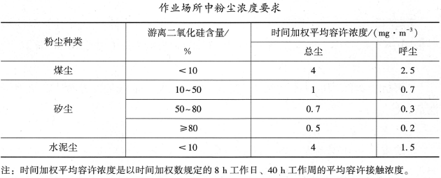 A煤尘中游离二氧化硅含量小于10%,总粉尘和呼吸性粉尘的时间加权平均容许浓度分别为4mg/m3和2.5mg/m3