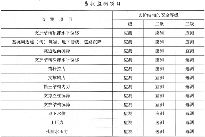 基坑支护机构的监测应根据结构类型和地下水控制方法按下表选择基坑监测项目。