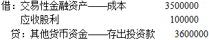 企业取得交易性金融资产时,应当按照该金融资产取得时的公允价值作为其初始入账金额,所支付价款中包含的已宣告但尚未发放的现金股利或已到付息期但尚未领取的债券利息,应当单独确认为应收项目,所发生的相关交易费用应当在发生时计入当期损益,冲减投资收益。因此,该项交易性金融资产的入账成本=3600000-100000=3500000(元)。购入时相关会计分录如下: ①购入股票②支付交易费用