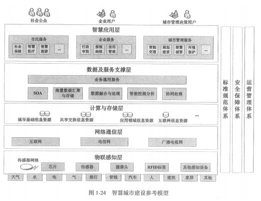 智慧城市建设参考模型包括:有依赖关系的五层和对建设有约束关系的三个支撑体系,如图下图所示。