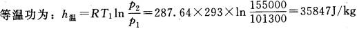 某离心空气压缩机,空气进口温度t=20℃,p1=101300Pa,p2=155000Pa,空气的气体常数R=287.64J/(kg·K),等熵指数k=1.4,多变指数n=1.59,则压缩质量1kg的空气的等温功为( )。