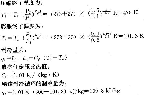 压缩式制冷装置压气机吸入的空气P1=0.1MPa,t1=27℃,定熵压缩至P2=0.5MPa.再经定压冷却后温度降为30℃,则该制冷循环的制冷量为( )kj/kg。