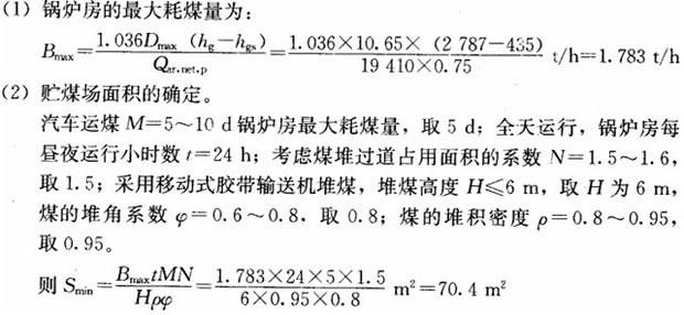 某工厂一座全天运行的锅炉房,采用两台SHL6-1.25-AⅡ型锅炉,给水采用大气热力除氧。由热负荷资料得知,该锅炉房的最大计算负荷为10.65t/h,平均热负荷为8.17t/h。燃煤由汽车从厂外运到锅炉房贮煤场,采用移动式胶带输送机堆煤,由铲车将煤运到受煤斗,然后由埋刮板输送机运到炉前贮煤斗,则该锅炉房贮煤场面积最小为( )㎡。