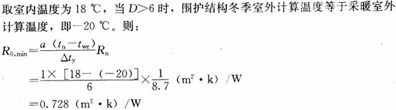 某建筑,外墙采用两砖墙,内抹灰(δ=20mm)。该外墙的热惰性指标D=6.627,采暖室外计算温度为-20℃,外墙内表面与室内空气允许温差为6℃,则围护结构最小传热阻为( )。