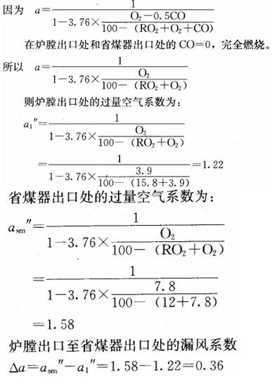 运行中的锅炉用奥氏烟气分析仪测得炉膛出口的烟气成分为O2=3.9%,CO=0,RO2=15.8%;省煤出口处的烟气成分为O2=7.8%,CO=0,RO2=12%,则炉膛出口至省煤器出口处的漏风系数Δa为( )。