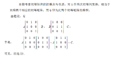 设A是3阶方阵,将A的第1列与第2列交换得B,再把B的第2列加到第3列得C, 则满足AQ=C的可逆矩阵Q为