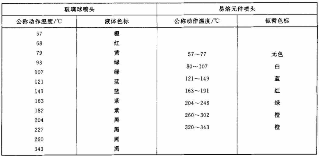 玻璃球洒水喷头的公称动作温度有13档,易熔元件洒水喷头的公称动作温度有7档。玻璃球洒水喷头的公称动作温度由不同颜色的玻璃球工作液进行标志,易熔元件洒水喷头的公称动作温度在喷头轭臂上作出相应的颜色标志。