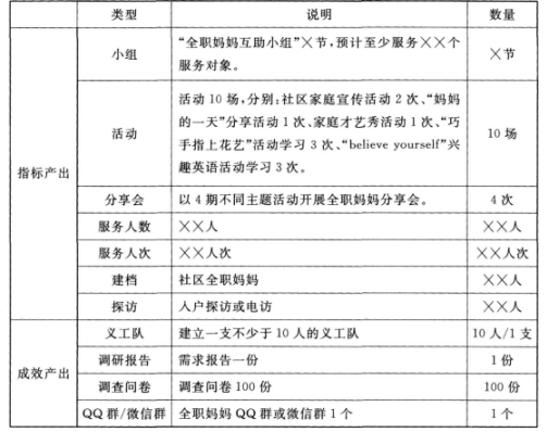 1.问题的陈述与分析 全职妈妈的生活重心围绕着家庭,接送孩子、做饭、打扫卫生成为生活的全部,这些枯燥、重复的工作使得全职妈妈容易情绪压抑、烦躁、易抱怨;容易忽视自我需要;少有自己的时间和娱乐。出现这些问题的原因有以下几点:一是全职妈妈受传统男主外,女主内的家庭观念影响,在工作与家庭无法兼顾的无奈下选择了做全职妈妈;二是家人及丈夫认为全职妈妈不上班就应该做家务照顾孩子,这都是全职妈妈的分内事,不仅较少给予关注和肯定,而且较少主动分担家务;三是全职妈妈对家庭付出的价值难以以金钱体现,没有固定的收入,全职妈妈的经济很难独立,这些使得全职妈妈本身对自己的付出和价值也产生了怀疑,这些都加重了全职妈妈的生活压力与苦恼,更有甚者变得精神抑郁。 针对这一问题,本项目可以从三方面入手: (1)采用优势视角理论,挖掘全职妈妈的自我优势和资源,为其增能。 (2)全职妈妈的心理调适,帮助她们找准定位,调整心态,提升全职妈妈的信心和自我价值感。 (3)采用社会支持理论,为全职妈妈构建社会支持网络,从家人、同辈、社区等角度提升他人对全职妈妈的理解与肯定。 2.项目设计 (1)项目名称:幸福家庭,由你支撑 (2)项目目标 总目标:提升全职妈妈的自我认同感,打破家庭、社会对全职主妇的固化认知。 具体目标: ①倡导家庭成员认识到全职妈妈对家庭的付出和辛劳,体谅全职妈妈的辛苦。 产出:开展社区调研一次;开展社区家庭宣传活动两场;至少 ××人次社区居民参与,80%参与人次认同全职妈妈价值。 ②帮助丈夫了解全职妈妈对家庭的奉献,认识到全职妈妈是幸福家庭的支撑者。 产出:开展分享 “妈妈的一天”活动一次;家庭才艺秀活动一次;至少夫妻及家庭××组参与。 ③为全职妈妈开展各项技能学习,为他们重返职场做准备。 产出:开展 “巧手指上花艺”活动学习3次;开展“believe yourself”兴趣英语活动学习3次,参与活动学习全职妈妈××人次。 ④成立全职妈妈互助小组,开展小组活动让她们彼此鼓励支持。 产出:建立全职妈妈QQ群、微信群;定期开展全职妈妈交流分享会;全职妈妈 ××人次。 (3)服务内容 ①介入理论:优势视角理论和社会支持理论 通过开展各项活动,帮助全职妈妈学习各项技能,帮助她们认识到自身优势,同时建立全职妈妈互助小组,开展社区活动等,为全职妈妈构建家庭、同辈、社区支持。 ②项目明细(4)项目管理:项目预算、人员分工、风险评估、资源整合。 (5)项目监测与评估 ①实施方评估:实施方评估包括项目执行中的监测工作和项目结束时的评估工作。 监测方面,根据项目的评估指标(活动量、参与者和成效)与评估方法,在每次活动、小组结束后进行评估、反思;项目年中和年终阶段完成项目成效报告。 评估方面,项目后期会以问卷调查、座谈会、同工评估等方式相结合,收集项目对服务对象的成效及影响。 ②第三方评估:在项目结束后,会以资助方所邀请的第三方评估标准为主,对本项目进行全面评估。