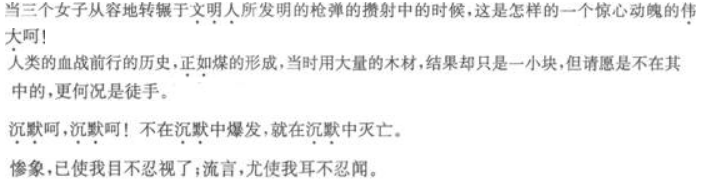 在上例中,例l是反语。这里鲁迅以“文明人”发明枪弹攒射我爱国青年,讽刺和揭露帝国主义者的不文明和残酷、野蛮。例2是比喻。作者意在以煤的形成所付出的巨大代价,比喻革命也须作出重大牺牲的道理(但鲁迅是不赞成徒手请愿的)。例3是反复。这里,鲁迅反复用了四次“沉默”。前两个强调当时是“万马齐喑”的黑暗社会;后两个用在选择复句中,预言人们的愤怒必将在沉默中爆发,实际上是呼唤革命。例4是一个对偶句。作者在“惨象”与“流言”的尖锐对立中,抒写自己的爱憎之情,揭露反动派制造惨案、散布流言的凶残和阴险。综上所述,可以看出,恰当地使用各种修辞手法, 不仅能使文章语言生动、活泼,富于变化,而且能准确地表达作者的思想感情,深化作品的主题。