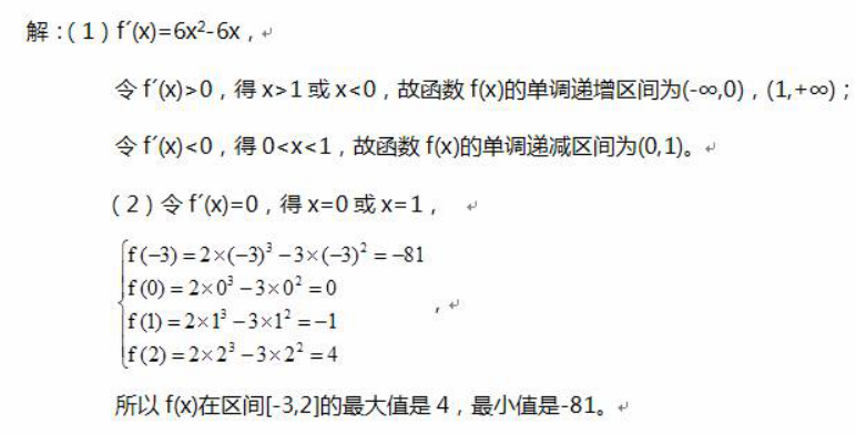 (本小题13分)已知函数f(x)=2x3-3x2,求 (1)函数的单调区间; (2)函数f(x)在区间[-3,2]的最大值与最小值。