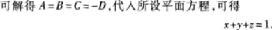 设所求平面方程为.由于点(1,0,0),(0,1,0),(0,0,1)都在平面上,将它们的坐标分别代入所设平面方程,可得方程组