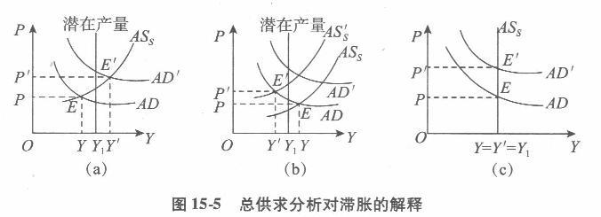 (1)总供给和总需求的含义。总供给是指整个经济社会在每一价格水平下提供的产品和劳务的总量。总供给函数表示国民收入(总产出量)和价格水平之间的数量关系。描述这一函数关系的曲线就是总供给曲线,可以用来表示国民收入和价格水平各种不同的组合。总供给曲线可以根据总生产函数、劳动需求函数和劳动供给函数以及货币工资曲线推导得到。 总需求指整个社会经济在每一价格水平下对产品和劳务的需求总量,总需求函数表示产品市场和货币市场同时达到均衡时的价格水平和国民收入之间的数量关系。描述这一函数关系的曲线被称为总需求曲线。由于实际资产效应、跨期替代效应和开放替代效应等因素,总需求曲线向右下方倾斜,表明在其他条件不变的情况下,价格水平和国民收入的反方向变动关系。可以从简单的凯恩斯模型和IS- LM模型中推导出总需求曲线。 作为凯恩斯主义重要代表的主流经济学派,他们试图用总供给曲线和总需求曲线来解释宏观经济运行,他们同时使用长期和短期总供给曲线,把向右上方倾斜的总供给曲线称为短期总供给曲线,把垂直的总供给曲线称为长期总供给曲线。 (2)运用总供求分析法对经济“滞胀”状态的解释。从图15-5(a)中可以看到,短期的收入和价格水平的决定有两种情况。第一种情况是,AD是总需求曲线,ASs是短期总供给曲线,二者交点E决定的收入或产量为y,价格水平为P,二者都处于很低的水平。这种情况表示经济处于萧条状态。第二种情况是,当总需求增加,总需求曲线从AD向右移动到AD’,短期总供给曲线ASs和新的总需求曲线AD’和交点E’决定的产量或收入为Y’,价格水平为P’,二者都处于很高的水平,这种情况表示经济处于高涨状态。现在假定短期总供给曲线由于受到供给冲击(如石油价格和工资等提高)而向左移动,但总需求曲线不发生变化。在这种情况下,短期收入和价格水平的决定可用图15-5(b)表示。 在图15-5(b)中,AD是总需求曲线,ASs是短期总供给曲线,二者交点E决定的产量或收人为y,价格水平为P。现在出现供给冲击,ASs左移到AS’s,与总需求曲线AD交于E’,E’点所决定的产量为y’,价格水平为P’,这个产量低于原来的产量,而价格水平却高于原来的价格水平,这种情况表示经济处于滞胀状态,即经济停滞和通货膨胀结合在一起的状态。(3)治理滞胀的对策。在政策主张上,主流学派经济学家认为,虽然资本主义经济在长期内可以处在充分就业的均衡状态,总需求增加只是提高了价格水平,而不改变产量或收入,如图15-5(c)所示。但短期内的萧条和过度繁荣是不可避免的,仍然可以给社会带来损失。因此,有必要执行凯恩斯主义的经济政策,以熨平萧条和过度繁荣所带来的经济波动,使经济持续处于稳定的充分就业的状态。 政府治理滞胀的对策主要有:①紧缩的货币政策;②扩张的财政政策;③实施减税和增加财政支出,利用财政杠杆调节产业结构和产品结构。