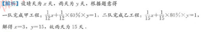甲、乙两项工程分别由一、二工程队负责完成,晴天时,一队完成甲工程需要12天,二队完成乙工程需要15天,雨天时,一队的工作效率是晴天时的60%,二队的工作效率是晴天时的80%,结果两队同时开工并同时完成各自的工程,那么,在这段施工期间雨天的天数为( )